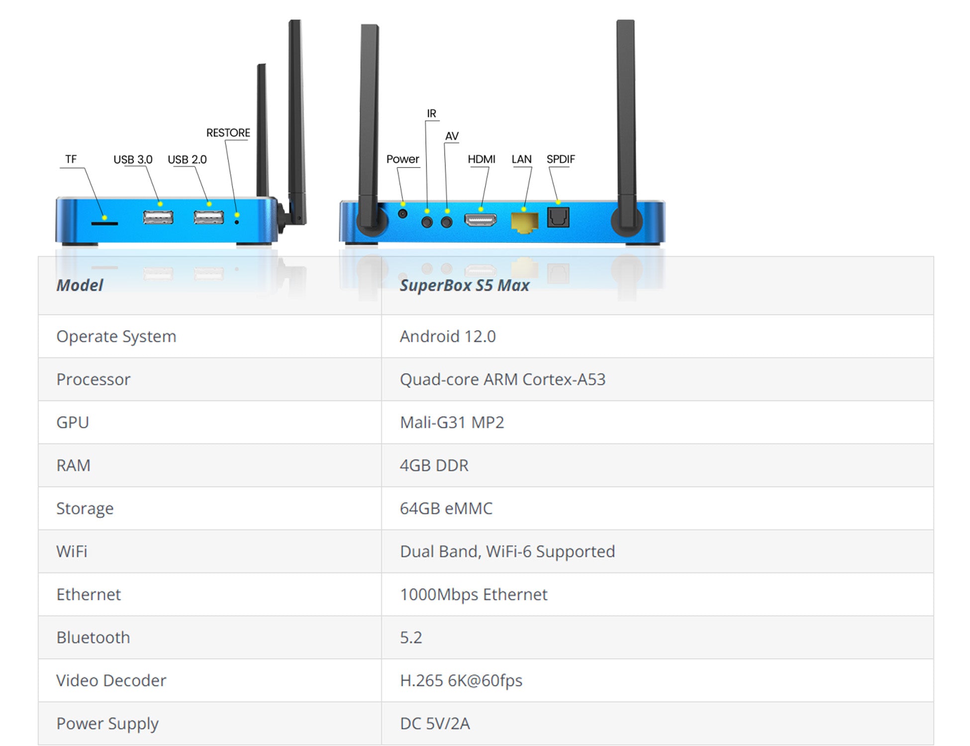 SuperBox S5 Max – a true entertainment powerhouse. Packed with 4GB of DDR and 64GB eMMC storage, it ensures uninterrupted performance. Embracing the advanced Android 12, the SuperBox S5 Max enhances your viewing experience. With WiFi 6 and dual external antennas, your connectivity soars to new heights, ensuring seamless streaming. Plus, the upgraded voice command system and Bluetooth remote control simplify your streaming experience. Prepare for an immersive journey into a world of endless content, all elegantly packaged within the sleek and sophisticated design of the SuperBox S5 Max.